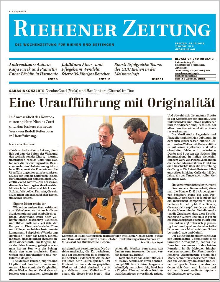 Am Sonntag, 21. Oktober fand in der Musikschule Riehen im Rahmen der Sarasinkonzerte ein ausserordentliches Konzert statt. Nicolas Corti, Bratsche und Han Jonkers, Gitarre, spielten im Musiksaal Werke in dieser seltenen Besetzung.