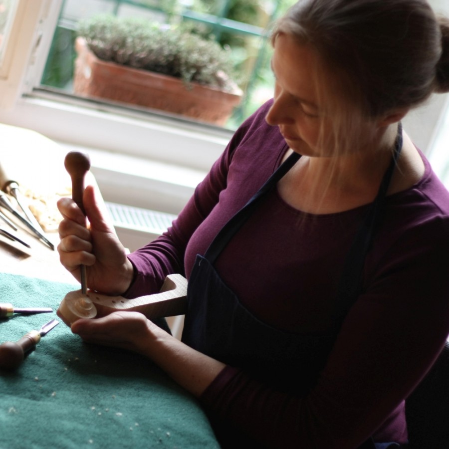 - Zunächst wird die Position der f-Löcher festgelegt, deren Kerben die Position des Steges bestimmen. Im Gegensatz zu Geige und Cello gibt es bei der Bratsche dafür kein festgelegtes Mass!