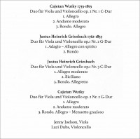 Nicht viel anders ist es Luzi Dubs ergangen, als er von Yvonne Mörgeli die noch nicht ordentlich gedruckten Notenblätter mit drei Duos von Justus Heinrich (Henry) Griesbach in der Besetzung Geige-Cello opus 1 zum Probespiel vorgesetzt bekam. Die ursprünglich vom Komponisten angedachte Variante für Geige und Cello bzw. für zwei Celli zeigte einige Tücken und Diskrepanzen, so dass Mörgeli die erste Stimme für die Bratsche transponierte. Ein Glücksfall! Luzi Dubs war von der Version Bratsche-Cello derart begeistert, dass er die Publikation unterstützte und vorantrieb.