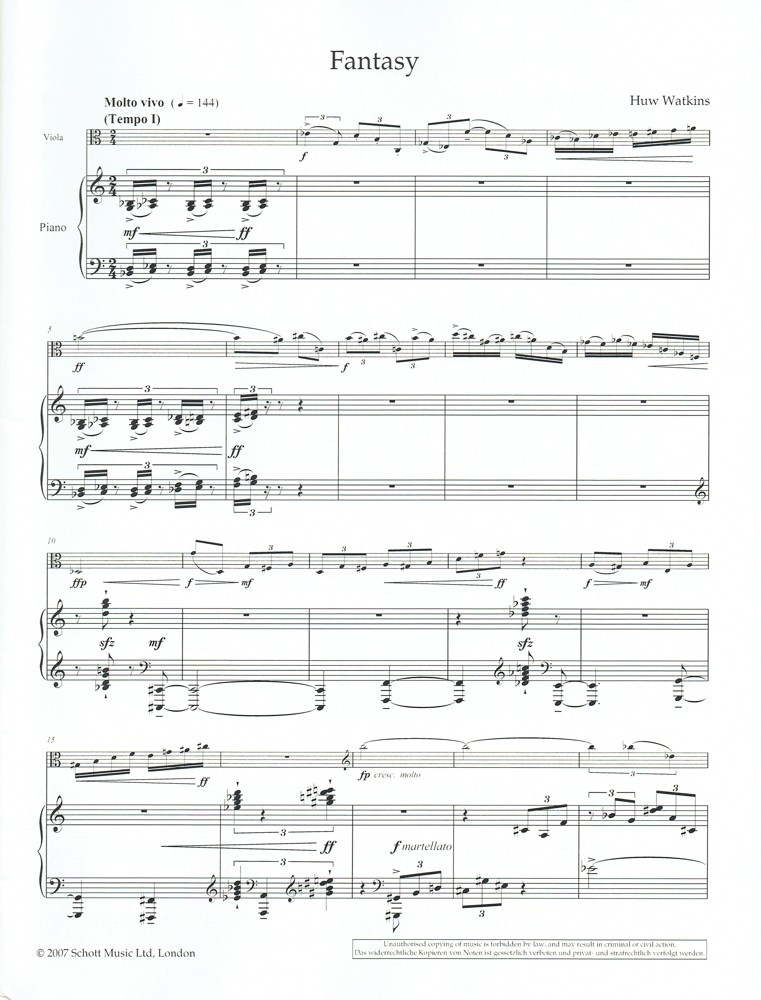 Beginnend mit einer ungeduldigen Geste in der Klavierstimme, die sofort von einer energischen Violalinie beantwortet wird, fällt das Klavier dann ein und unterbricht. Das ist die Ausgangssituation für Watkins Fantasy, einem zeitgenössischen Werk, das in der Tradition des Barock geschrieben ist und viele äusserst gegensätzliche Abschnitte aufweist. Weite Abschnitte, die sich die lyrischen Eigenschaften der Viola zunutze machen, sind geschickt - oft abrupt - nebeneinander gestellt, mit neuen, aber in Bezug dazu stehenden Ideen. Das Werk wurde für den international gefeierten Bratschisten Lawrence Power geschrieben und auch von ihm angeregt.