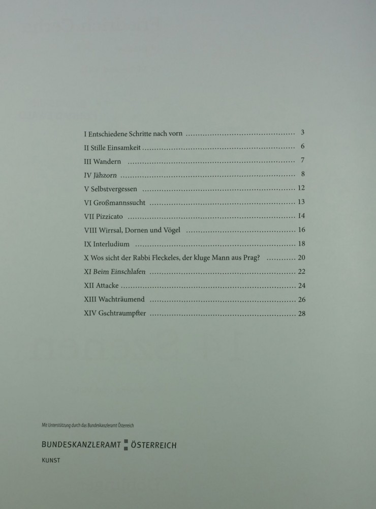 Entschiedene Schritte nach vorn Stille Einsamkeit Wandern Jähzorn Selbstvergessen Grossmannsucht Pizzicato Wirrsal, Dornen und Vögel Interdudium Wos sicht der Rabbi Fleckeles, der kluge Mann aus Prag? Beim Einschlafen Attacke Wachträumend Gschtraumpfter.