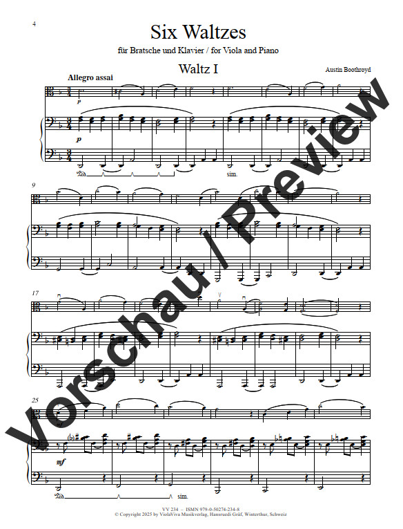 Der beschwingte Fluss des Walzers und die ausdrucksstarke lyrische Melodie, die oft im höheren Register der Bratsche angesiedelt ist, bilden das Herzstück dieser Sammlung von Der beschwingte Fluss des Walzers und die ausdrucksstarke lyrische Melodie, die oft im höheren Register der Bratsche angesiedelt ist, bilden das Herzstück dieser Sammlung von Stücken für Bratsche und Klavier. Die sechs Walzer erforschen sanft die Magie und Liebe zur Live-Performance, während die beiden Spieler sich in einem musikalischen Gespräch Stücken für Bratsche und Klavier. Die sechs Walzer erforschen sanft die Magie und Liebe zur Live-Performance, während die beiden Spieler sich in einem musikalischen Gespräch vereinen.