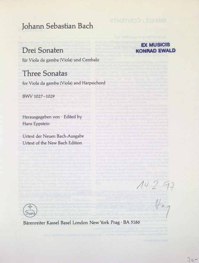Es ist erstaunlich, dass der Henle-Verlag, der für seine qualitätvollen Urtext-Ausgaben bekannt ist, sich dazu hinreißen lässt, von den drei Sonaten für Viola da gamba und obligates Cembalo auch Fassungen für Violoncello bzw. Viola anzubieten, die jeglicher Quellengrundlage entbehren. Begründet wird diese Entscheidung folgendermaßen: «Angesichts der bereits bei Bach üblichen Bearbeitungspraxis liegt es nahe, die Gambensonaten in einer modernen Ausgabe neben dem Originalinstrument auch für die verwandten Besetzungen Violoncello und Viola anzubieten. Hiermit wird einer zu Recht lange etablierten Aufführungstradition Rechnung getragen. [...] Die Violastimme wählt gelegentlich die dem Tonumfang des Instruments angemessene Oktavlage abweichend von der Originalgestalt. Die betreffenden Abschnitte sind in der Stimme gekennzeichnet.»
