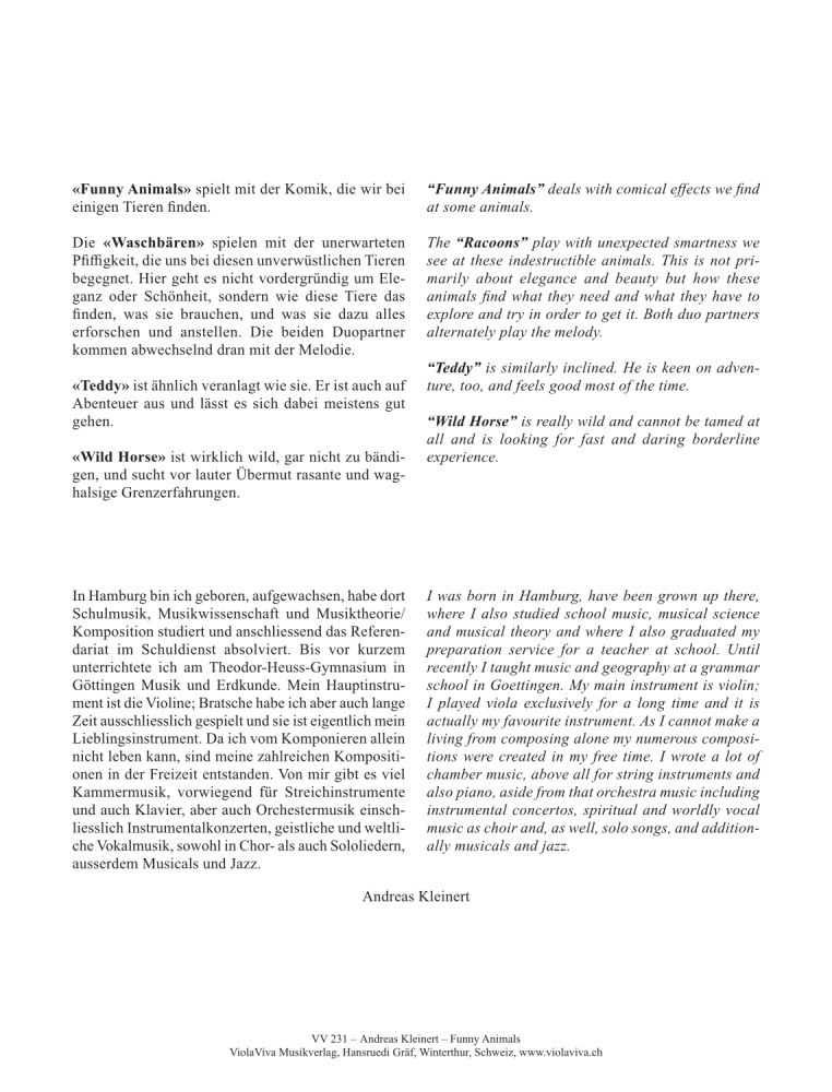 «Funny Animals» spielt mit der Komik, die wir bei einigen Tieren finden.Die «Waschbären» spielen mit der unerwarteten Pfiffigkeit, die uns bei diesen unverwüstlichen Tieren begegnet. Hier geht es nicht vordergründig um Ele-ganz oder Schönheit, sondern wie diese Tiere das finden, was sie brauchen, und was sie dazu alles erforschen und anstellen. Die beiden Duopartner kom-men abwechselnd dran mit der Melodie. «Teddy» ist ähnlich veranlagt wie sie. Er ist auch auf Abenteuer aus und lässt es sich dabei meistens gut gehen. «Wild Horse» ist wirklich wild, gar nicht zu bändigen, und sucht vor lauter Übermut rasante und waghalsige Grenzerfahrungen.Andreas Kleinert