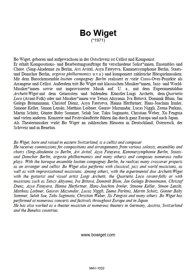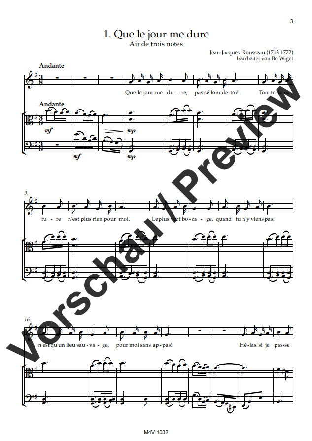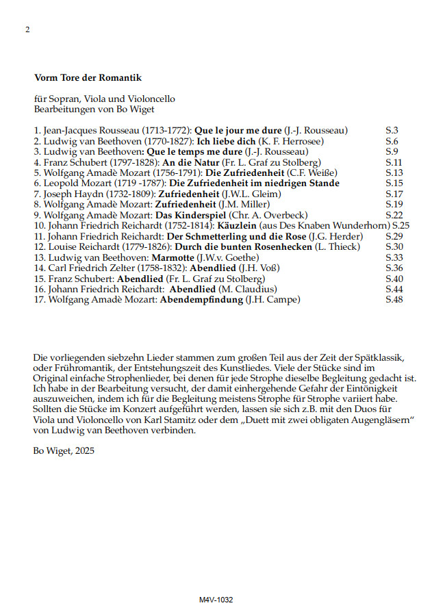 Die vorliegenden siebzehn Lieder stammen zum grossen Teil aus der Zeit der Spätklassik, oder Frühromantik, der Entstehungszeit des Kunstliedes. Viele der Stücke sind im Original einfache Strophenlieder, bei denen für jede Strophe dieselbe Begleitung gedacht ist. Ich habe in der Bearbeitung versucht, der damit einhergehende Gefahr der Eintönigkeit auszuweichen, indem ich für die Begleitung meistens Strophe für Strophe variiert habe. Sollten die Stücke im Konzert aufgeführt werden, lassen sie sich z.B. mit den Duos für Viola und Violoncello von Karl Stamitz oder dem «Duett mit zwei obligaten Augengläsern» von Ludwig van Beethoven verbinden. Bo Wiget