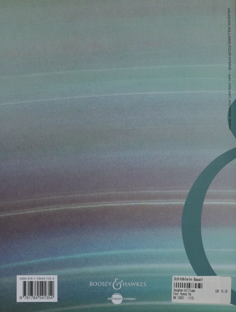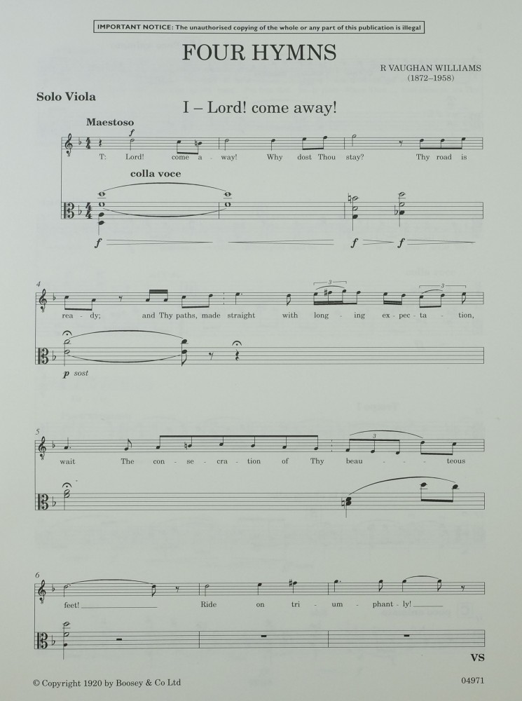 Die Four Hymns von Ralph Vaughan Williams sind stilistisch ähnlich wie die Five Mystical Songs (1911), wenn auch in einer kleineren und intimeren Form. Zusammen mit der Fantasia on a Theme of Thomas Tallis zeigen diese drei aufeinanderfolgenden Werke einen stark mystischen, meditativen Gehalt. Die erste der vier Hymnen, 'Lord! come away!', verwendet lebhaft purcellianische Rezitative und ist eine Vertonung eines Textes für Palmsonntag aus dem Golden Grove (einem Manual mit täglichen Gebeten) von Bischof Jeremy Taylor aus dem 17. Jahrhundert. 'Who is this fair one?' (Text von Isaac Watts, 1674-1748) ist ein Dialog für Tenor und Viola über die göttliche Liebe. Wie von Christopher Palmer beschrieben, atmet 'Come Love, come Lord' (Text von Richard Crashaw, c1613-49) «den Geist einer mystischen Abgeschiedenheit, die später zur pastoralen Sinfonie wird». Die finale 'Evening Hymn' ist eine strahlende Vertonung einer Übersetzung eines griechischen Gedichtes aus der Zeit vor dem vierten Jahrhundert von Robert Bridges, die durch ihre kontrapunktische Könnerschaft über einem glockenhaften Ostinato im Bass besticht. Four Hymns ist auch in einer Version für Tenor, Viola und Klavier erhältlich (979-0-060-02852-6). Die Studienpartitur (978-0-85162-908-7) kann als Klavierauszug für die Orchesterfassung dienen. Dennoch ist die Solo-Violastimme (Orchesterfassung) nicht kompatibel mit der Fassung für Klavier.