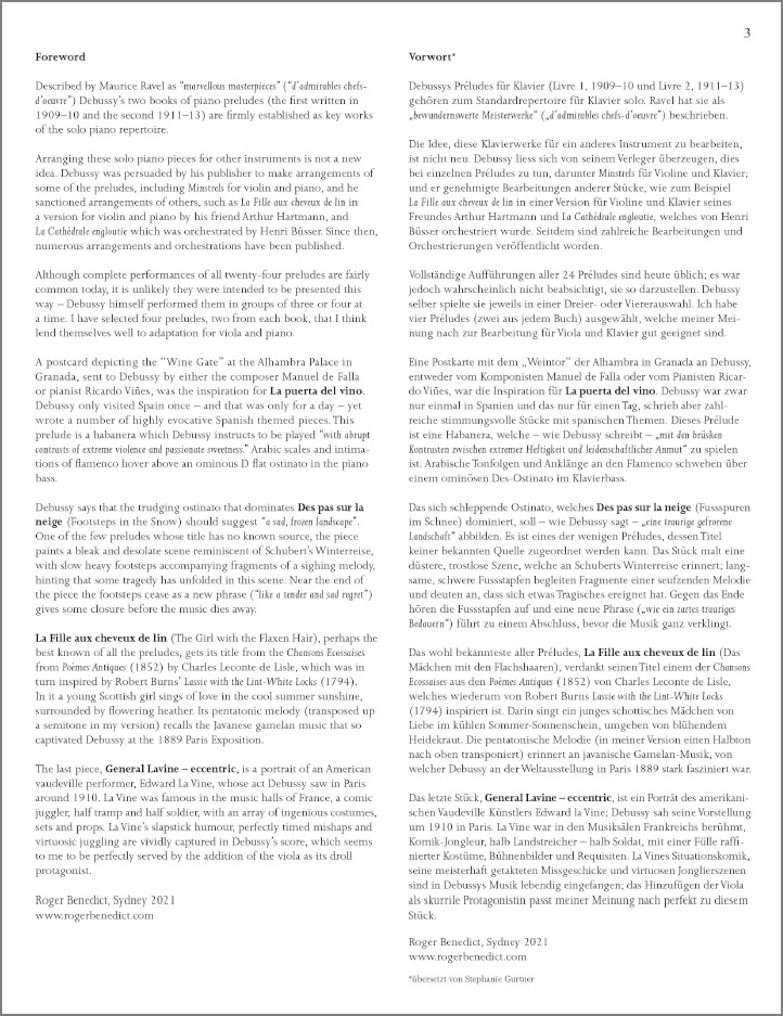 Eine wunderschön bearbeitete Auswahl von 4 der 24 Préludes für Klavier solo die sich gut zur Bearbeitung für Bratsche und Klavier eignen, arrangiert vom renommierten Bratschisten Roger Benedict. Schwierigkeitsgrad: 4 (von 6).
